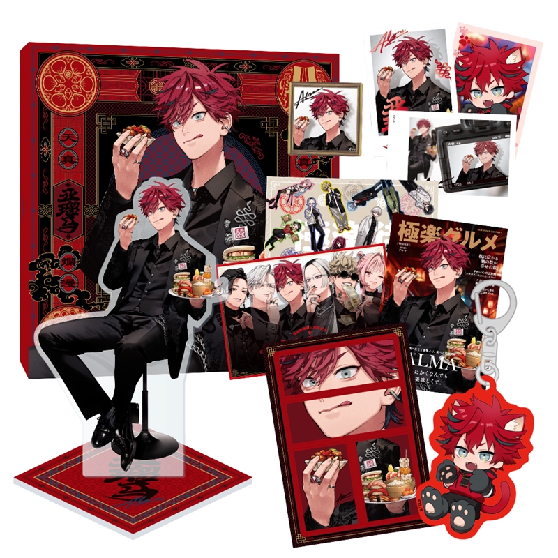 「極楽街 近すぎて美しい極近店」より、アルマのグッズがたくさん入ったスペシャルボックスが登場! アクリルスタンド1個、角缶バッジ1個、アクリルキーホルダー1個、トレーディングカード3枚、ポストカード3枚、シール1枚が入った、飾っても嬉しい豪華仕様です!