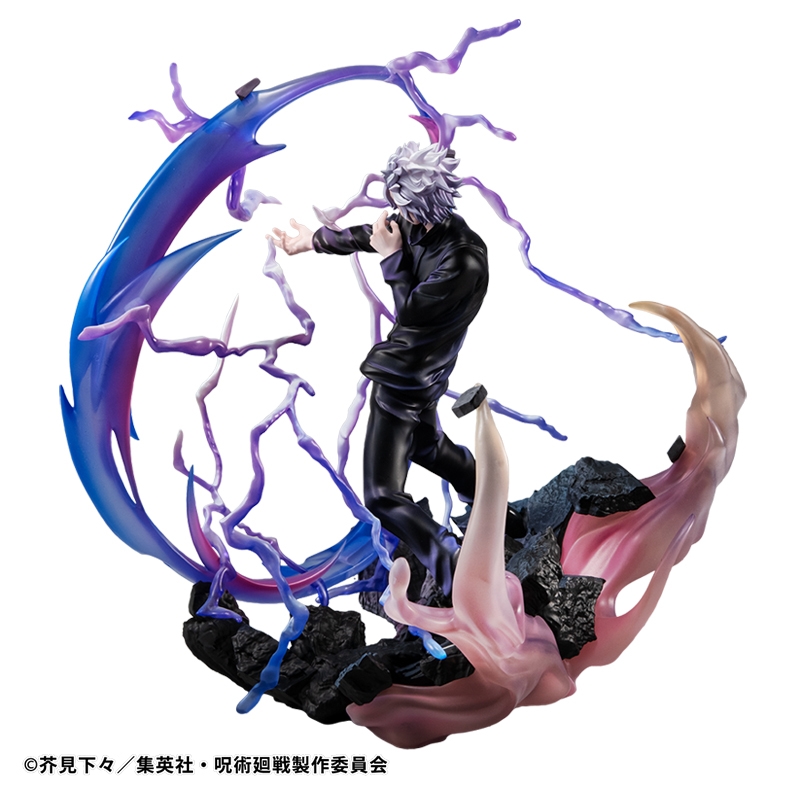 『呪術廻戦』より、五条悟が大ボリュームで再登場します。作中のイメージそのままに、虚式「紫」を放つ姿をエフェクト造形も盛り込み大迫力に立体化しました。
