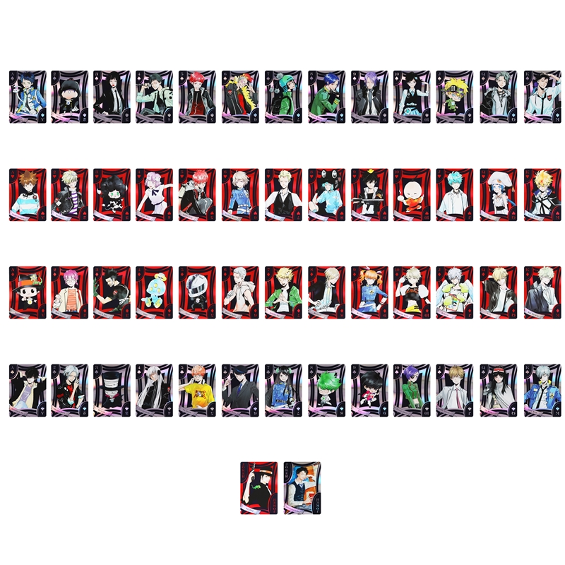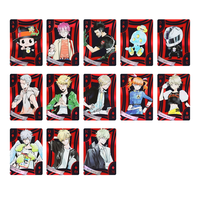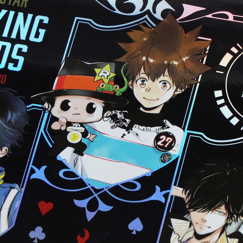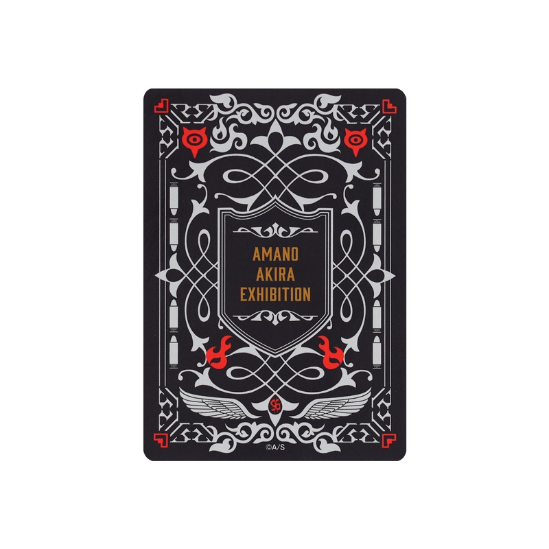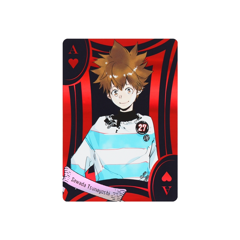 「天野明展」キービジュアルのために描きおろされたキャラクターイラストを使用した特別感あふれるオーロラ箔トランプ。ジョーカーには既存イラストの「大人姿のリボーン」と「学生時代の鴨乃橋ロン」のイラストを使用。