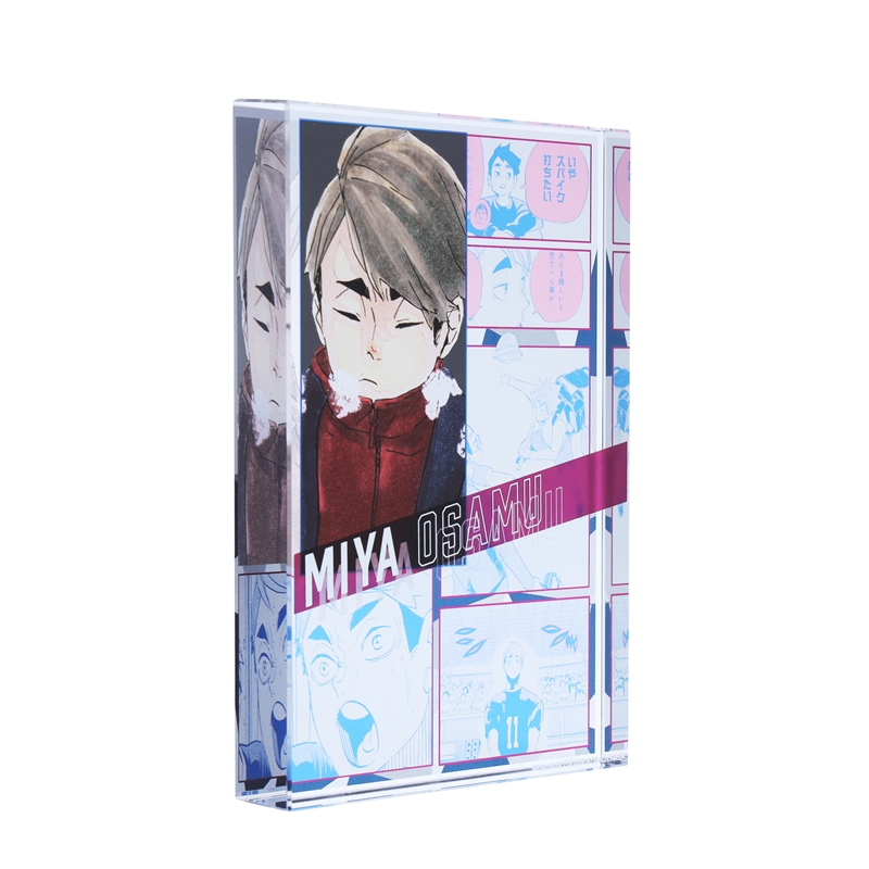 『ハイキュー!!』宮治のアクリルブロック!厚さ20mmのアクリルは存在感MAX!!宮治のかっこいいカラーカットの背面には、名シーンのコマが散りばめられているぞ。インテリアにぴったり!